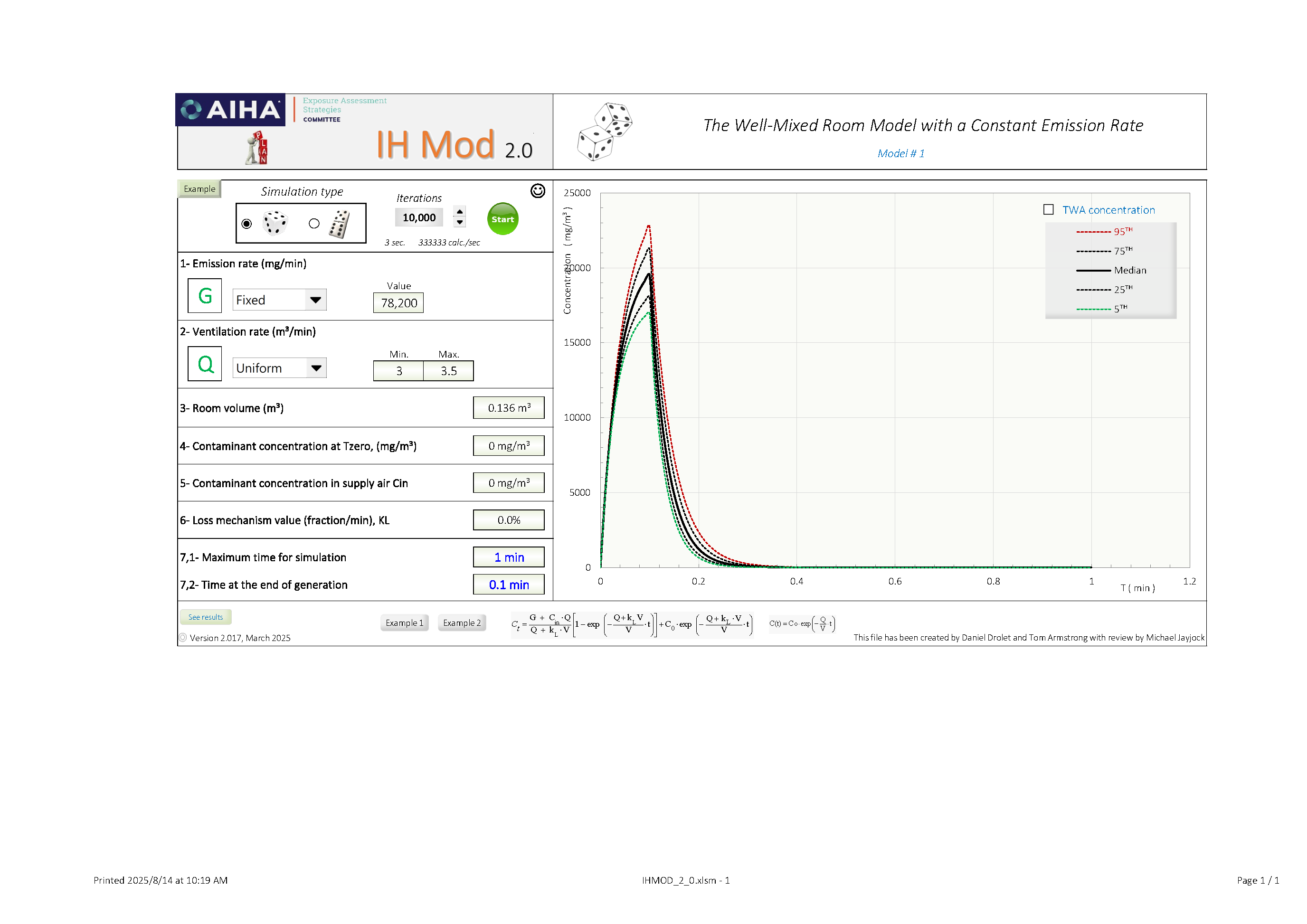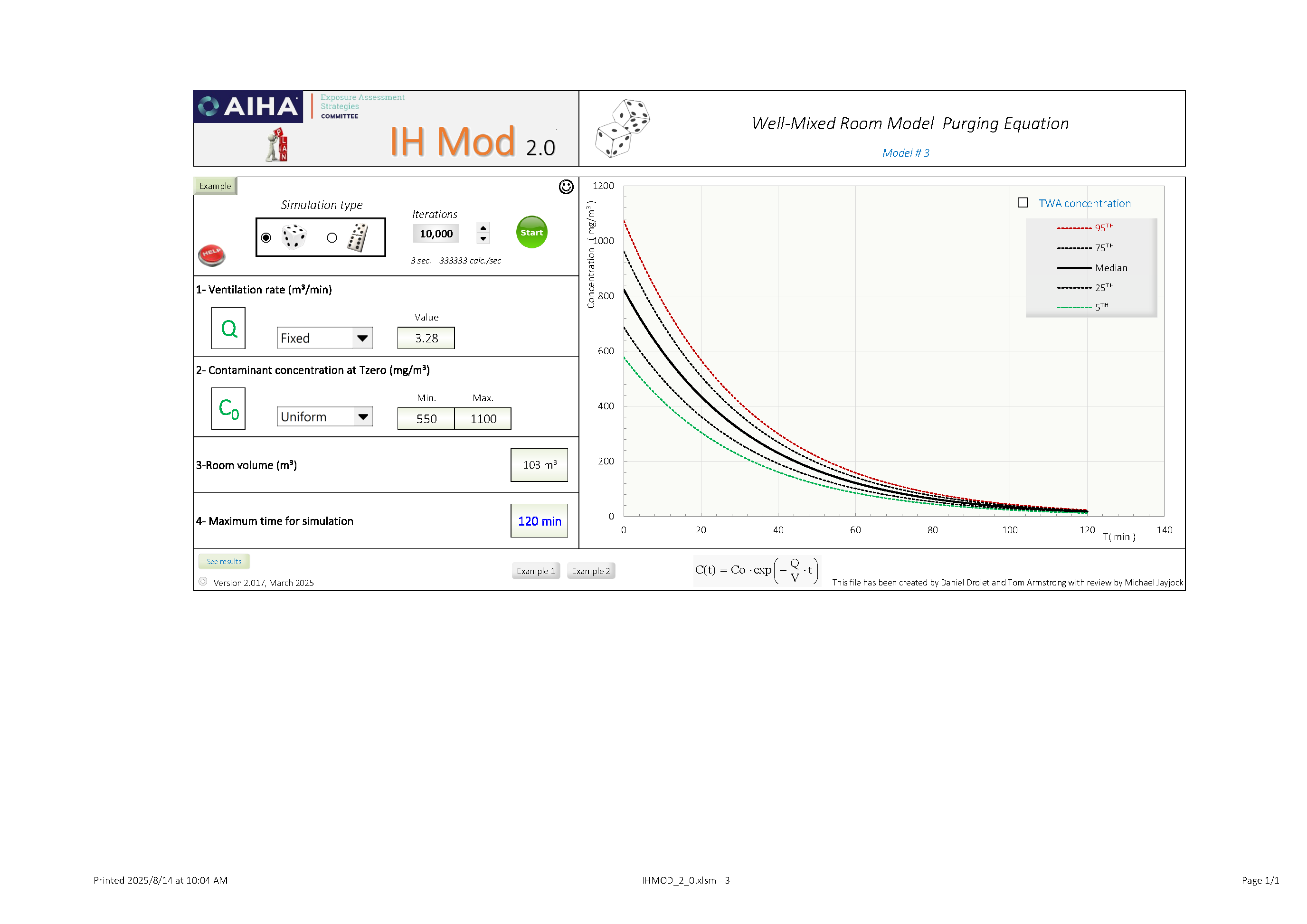 - 濃度衰減 (完全混合模式WMR): 在汙染源被移除後,此模型預測房間濃度會因通風而下降。計算顯示,大約需要 50分鐘,濃度才能降至安全的TLV-TWA標準以下,這為安全進入提供了時間依據。